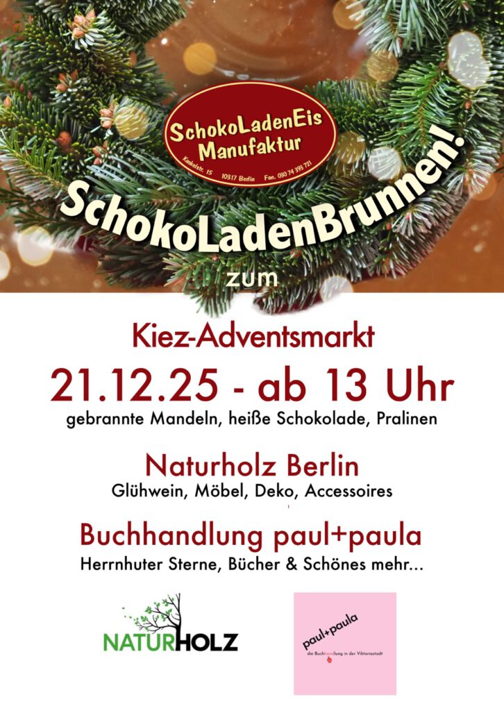 – Advent-Spezial: am 13.12. & 20.12.2025 im Laden Schokobrunnen! (3,- € pro Person) Auch am 21.12. zum KiezAdvent von 13-18 Uhr mit der Buchhandlung paul+paula und Naturholz!